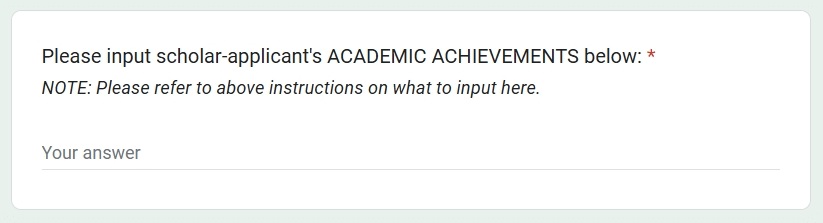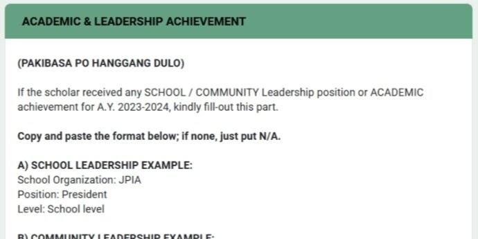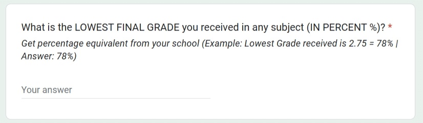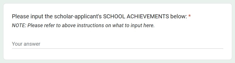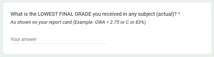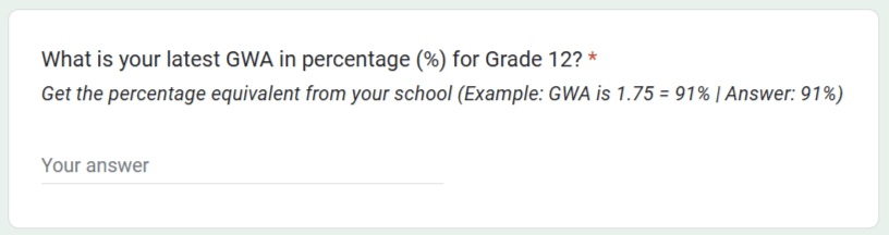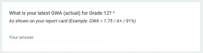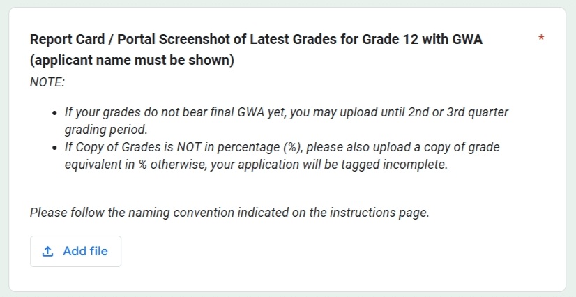 You may upload your 1st-semester grades or 2nd grading period grades with GWA. Your high school Transcript of Records (TOR) will be required if you move forward to the interview stage.